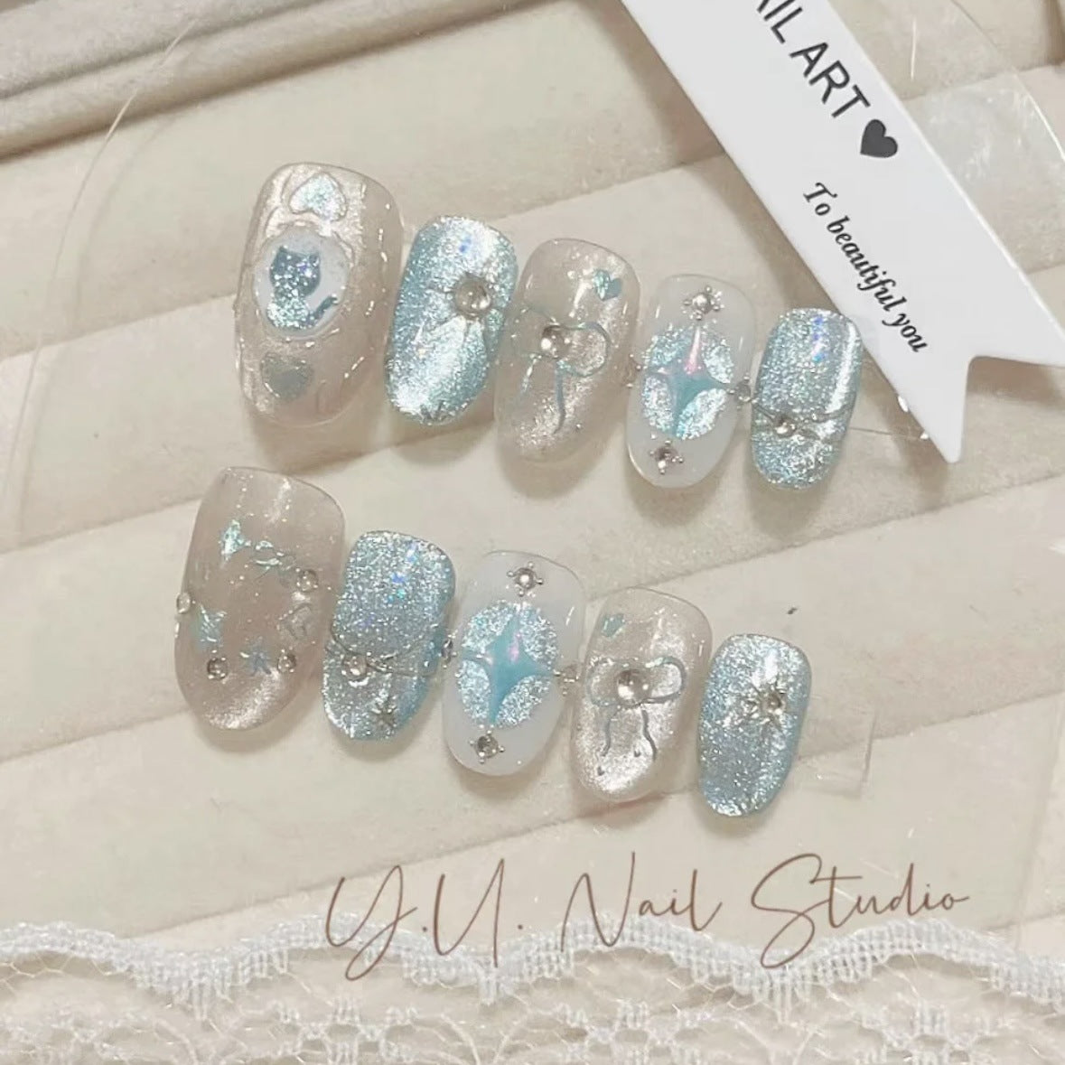 Blue Cat Cat Eye(Handmade press on nails)/10Pcs Oval Nails