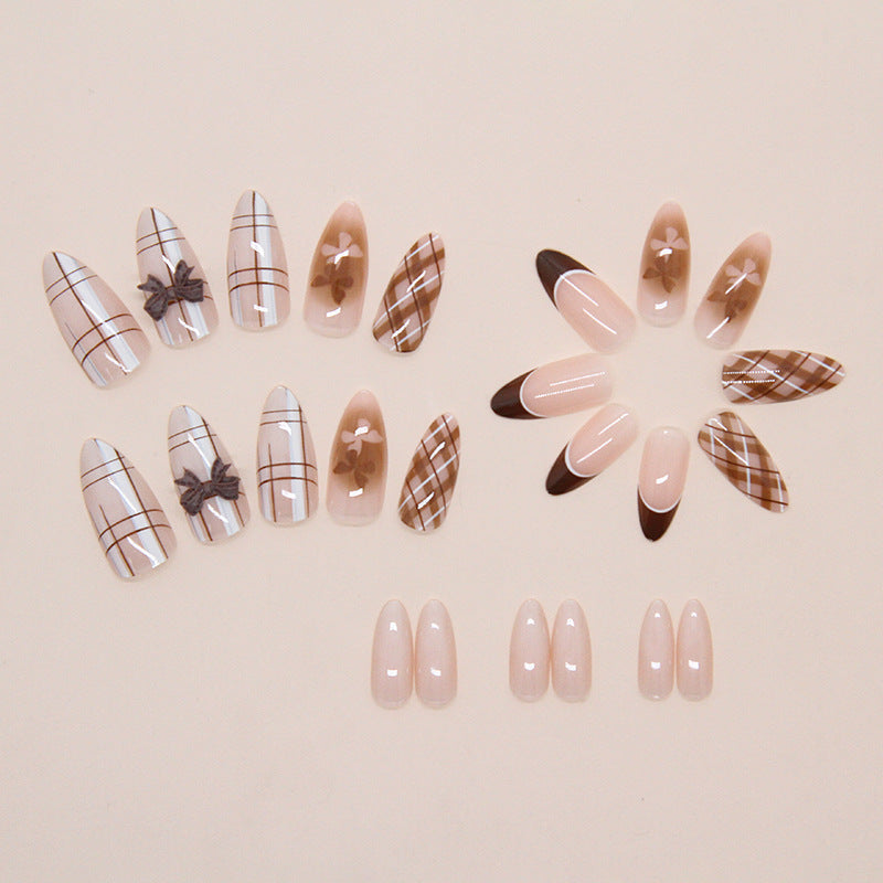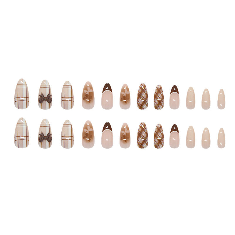 Plaid French Bow Press on Nails 24Pcs Medium Almond Nails