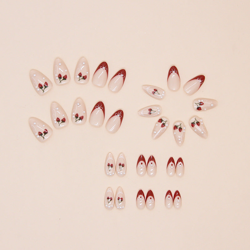 Cherry Pearls Press on Nails 24Pcs Short Almond Nails